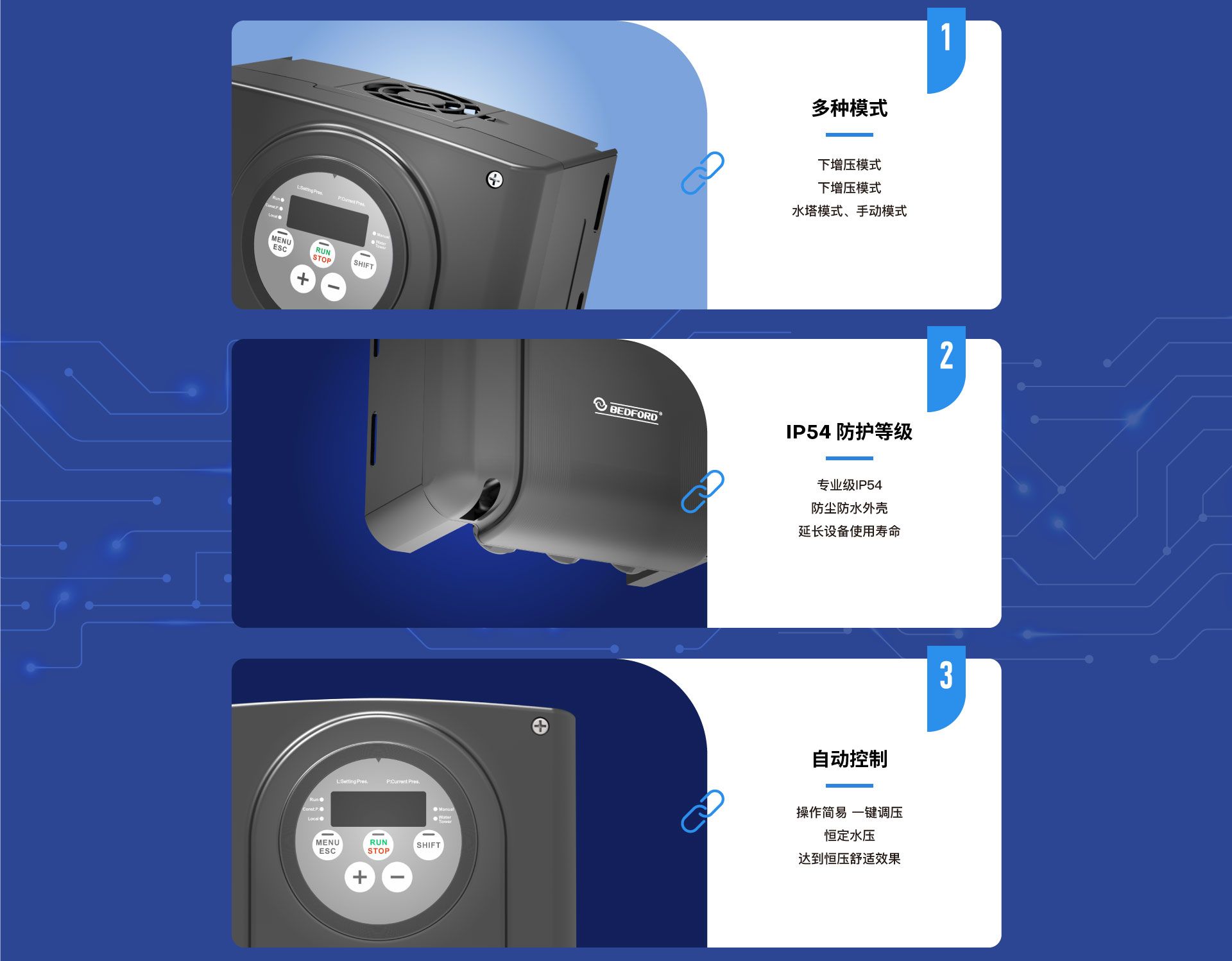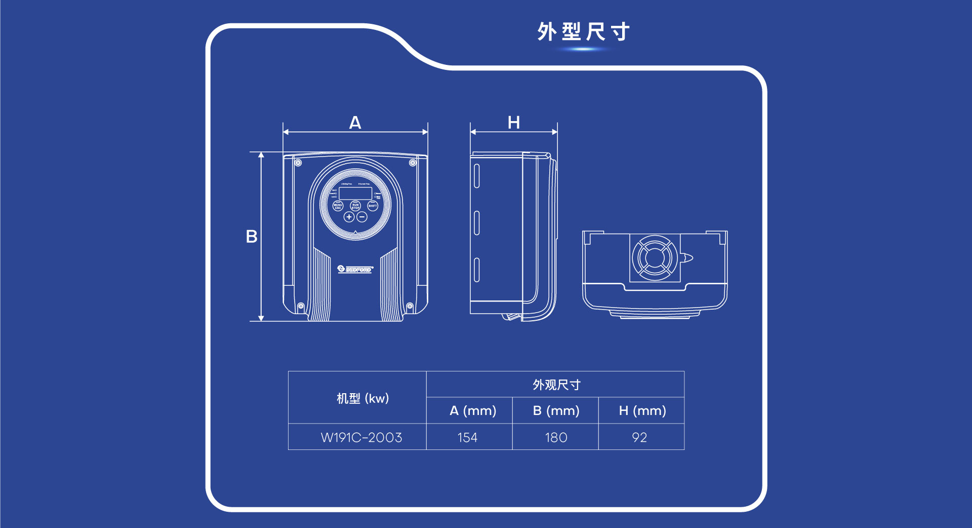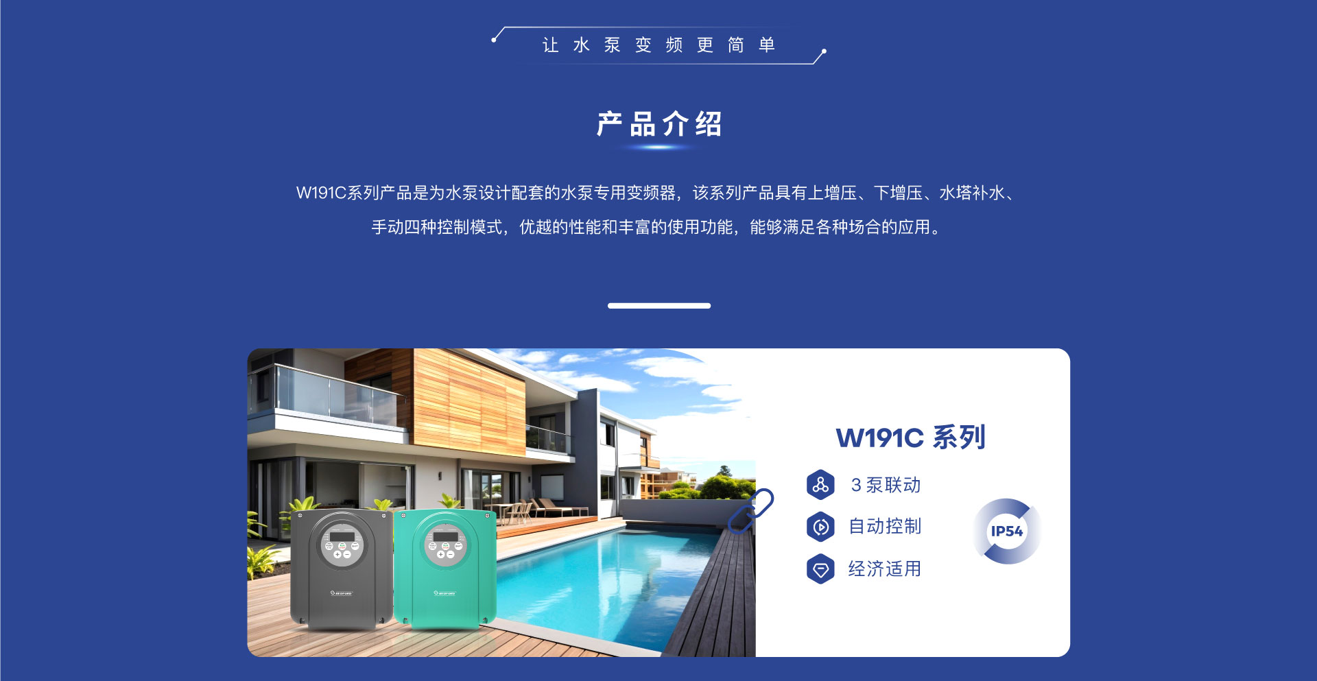 W191C 系列产品是为水泵设计配套的水泵专用变频器,该系列产品具有上增压、下增压、水塔补水、手动四种控制模式,优越的性能和丰富的使用功能,能够满足各种场合的应用。